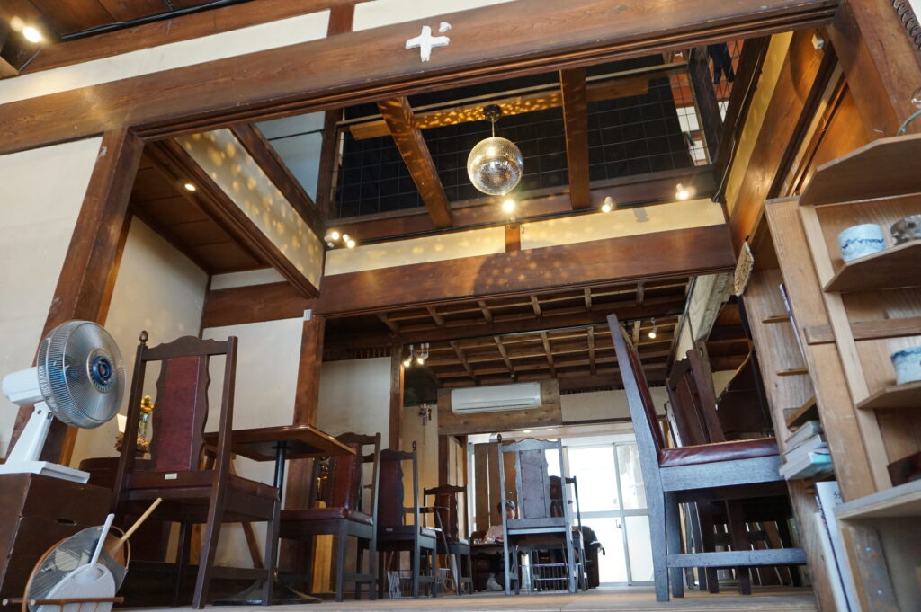 元の雰囲気を生かしつつ改装された店内。開放的な吹き抜けが特徴的です。