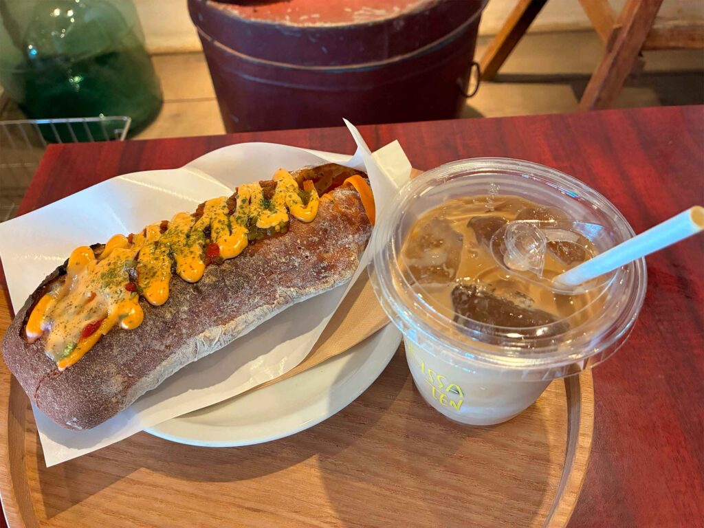 こちらはおすすめのホットドッグとカフェオレ。中では”KISSA TEN”が営業しており、ドリンクや軽食の販売をしています。