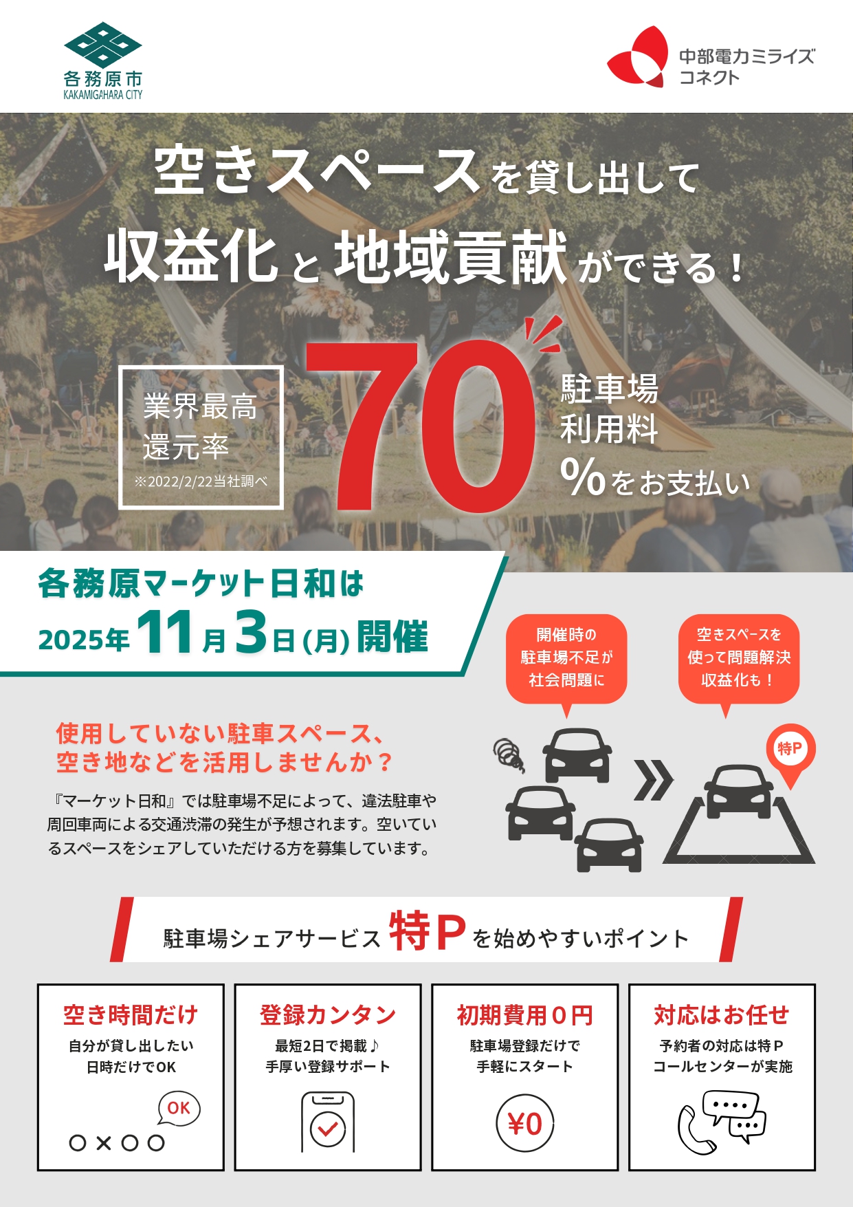 ※各務原市と中部電力ミライズコネクト(株)は、駐車場シェアサービス「特P」活用に関する連携協定を締結しています。
